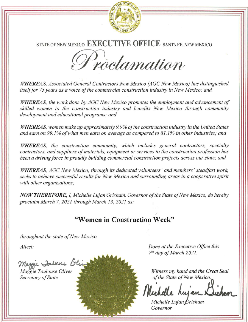 Thank you Governor Michelle Lujan Grisham for the State of New Mexico Proclamation for Women in Construction Week, Mar. 7th-13th.